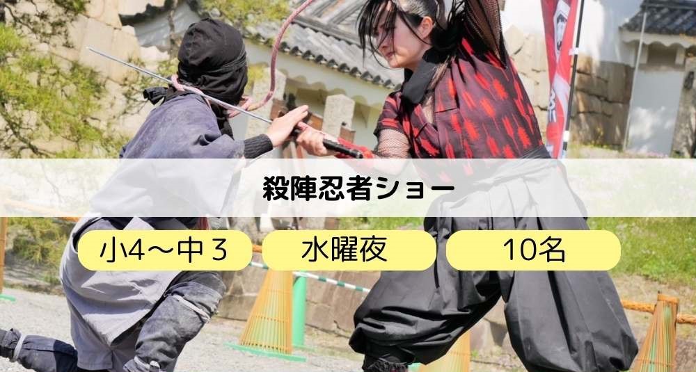 殺陣忍者ショー 体験内容殺陣(たて)とは、時代劇などで見る日本刀を使ったアクションのことです。アクロバティックな動きを行いながら、演技力も身に付けていく、本格的なパフォーマンスを体験できます。君も伊賀忍者の一人としてデビューしてみよう! ...