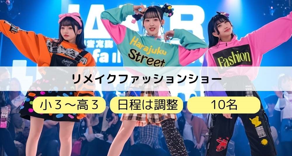 リメイクファッションショー 体験内容サイズアウトした服や、アレンジしてみたい服を持ち寄って、可愛く、かっこよくリメイクしたものを身に付けて、ステージをモデルのように歩きます。自分がステージを歩くのが恥ずかしい子は、友達にモデルをお願いした... -