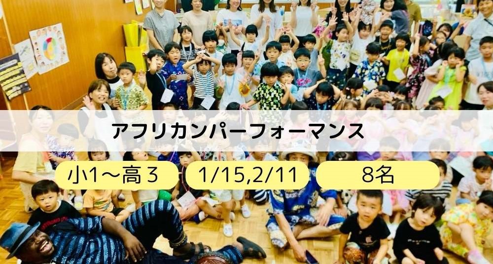 アフリカンパフォーマンス 体験内容アフリカの独特なリズムは勝手に体が動き出すほど気持ちよいです。全身を使った激しくかっこいいパフォーマンスで、会場中を湧かせましょう! 募集要項対象者小学1年生~高校3年生募集定員8名受講日1月13日(祝)、2/13... -